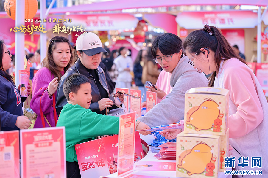 “心安是归处,非遗即生活。”在2026云南非遗过大年活动期间,昆明市南屏街广场上的“市井百工——淘宝中国宝贝·非遗年货大观园”内人头攒动,琳琅满目的年货吸引市民游客驻足挑选,热闹非凡。(完)