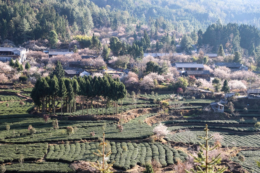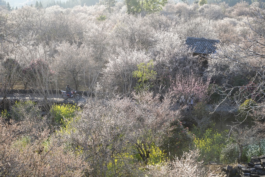 春节前夕,云南省腾冲市中和镇中营村万亩梅花竞相绽放,吸引众多游客自驾前往赏花游玩。