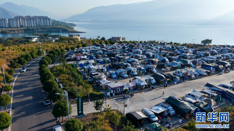 航拍巧家县栗喉蜂虎房车营地(2月10日摄)。新华网发(谢凌宇 供图)