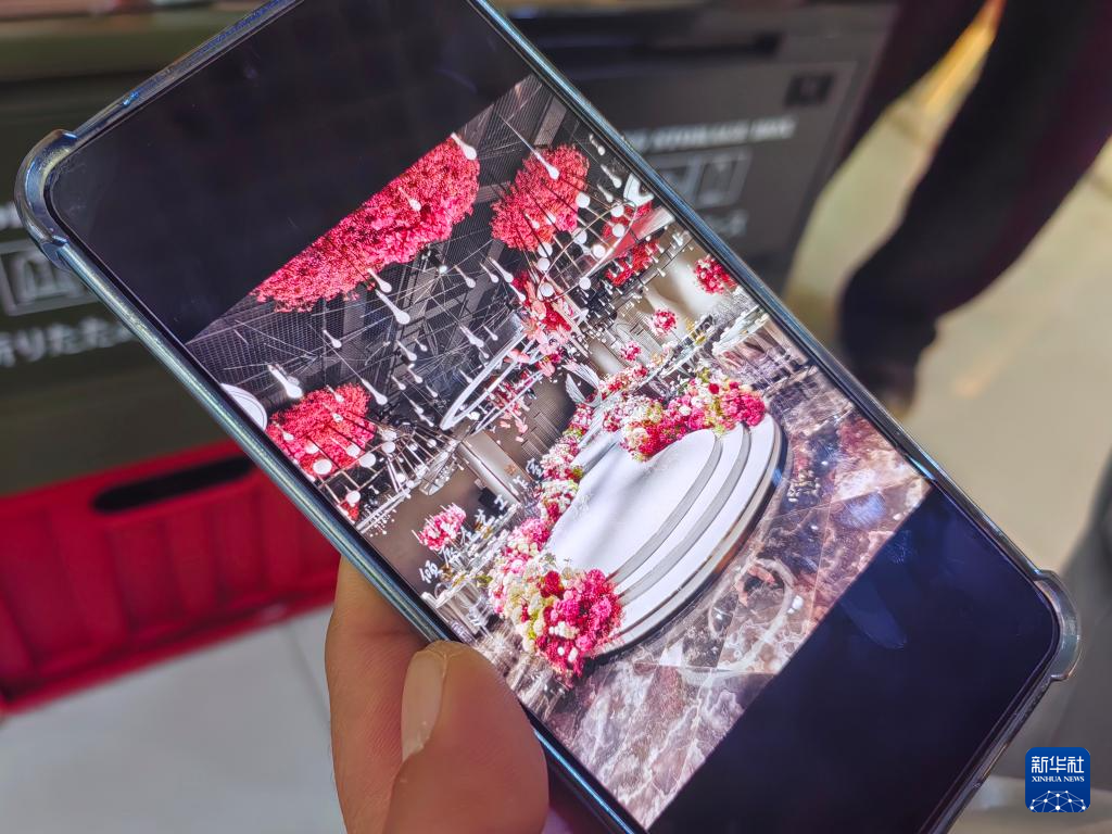 花艺培训学校的学员展示自己曾参与的花艺场景布置照片。新华社记者荆昭延 摄