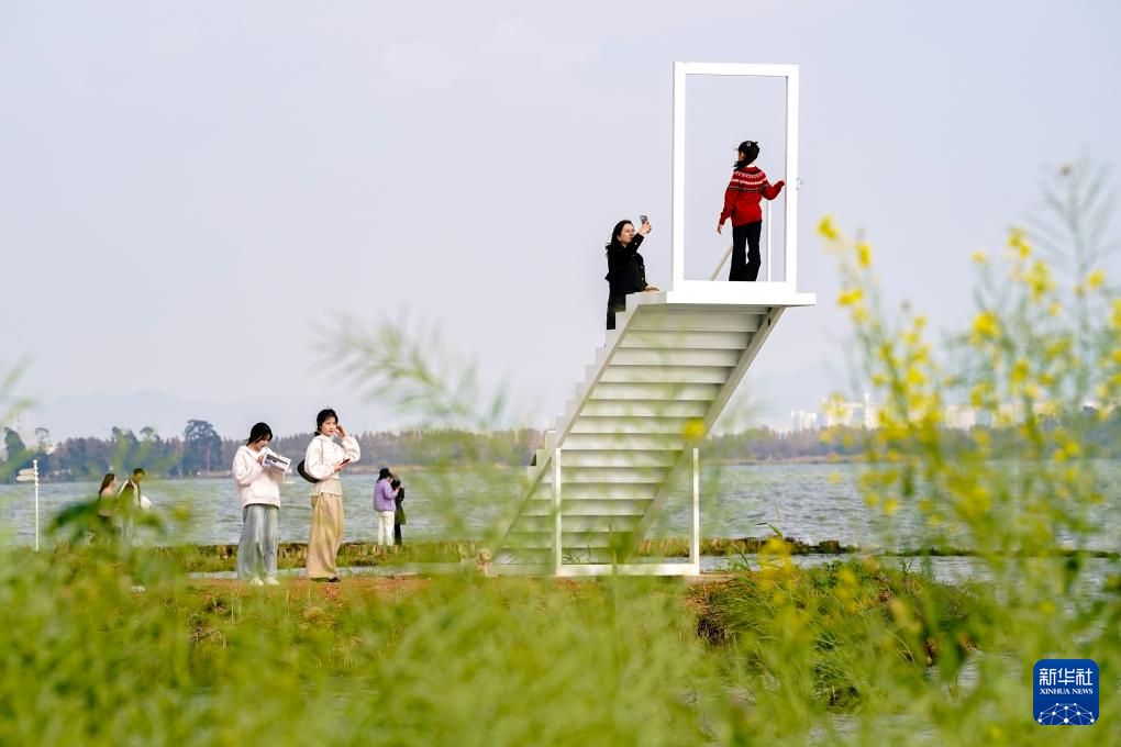 2月26日,游客在滇池边一处拍照装置拍照。新华社记者 陈欣波 摄