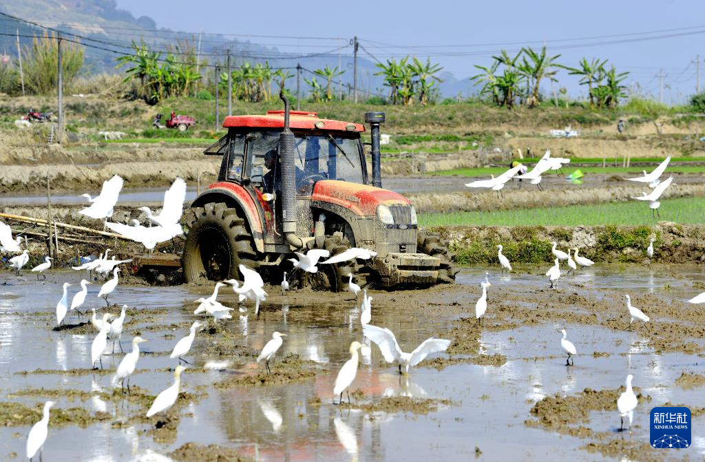 2月28日,在云南省西双版纳州勐海县勐混镇曼扫村,村民驾驶拖拉机犁田。新华社发(佐连江摄)