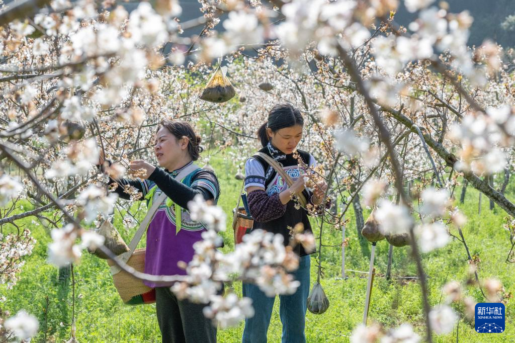 2月27日,在云南省文山壮族苗族自治州文山市东山乡,村民在樱桃种植基地进行管护。新华社发(熊平祥摄)