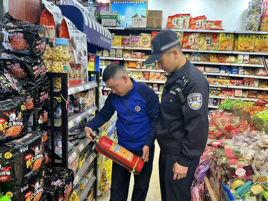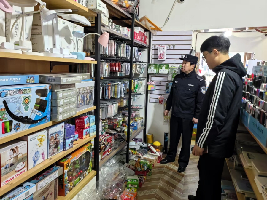 西城派出所民警检查校园周边商铺(3月1日摄)。