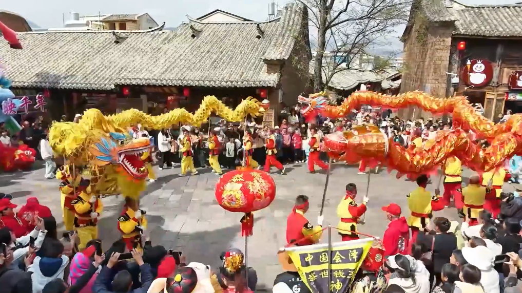 接灯巡游队伍在会泽古城内的多条街巷巡回展演,迎春元宵联台歌舞表演精彩纷呈。