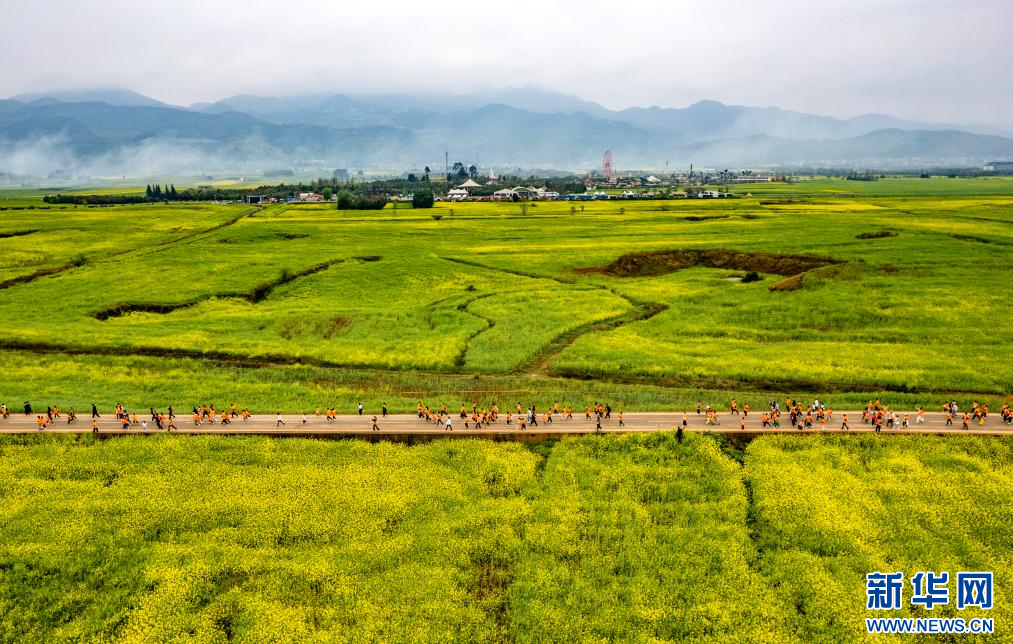 3月14日,参赛选手在2026曲靖罗平花海马拉松健康跑比赛中(无人机照片)。新华社记者 陈欣波 摄