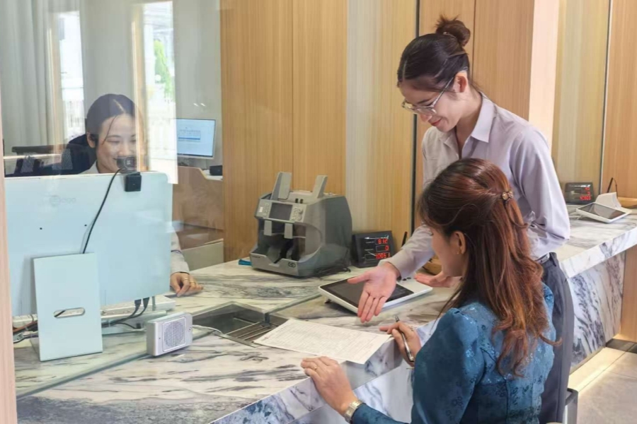 当地客户到老中银行琅勃拉邦分行办理业务(3月26日摄)。