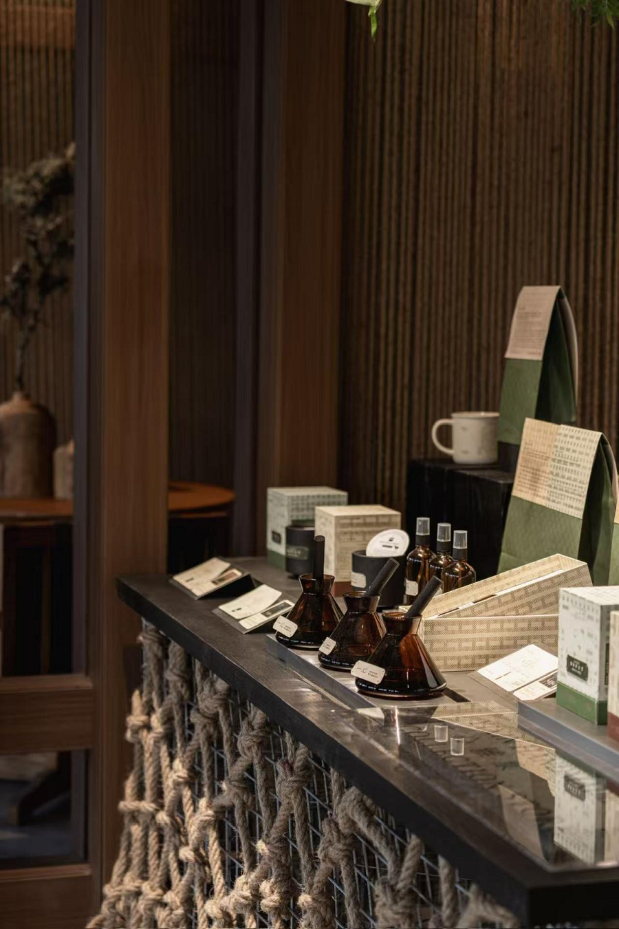在空间设计上,门店以竹艺、绳结、编织元素贯穿,营造出商圈中雅致的休憩空间。除现制饮品与烘焙外,店内还延伸出售养生茶包、香氛、杯子等零售周边,成功构建了“饮用+体验+零售”的一体化消费场景。这种业态模式,不仅满足了消费者对健康饮品的需求,更提供了一种放松疗愈的生活方式。