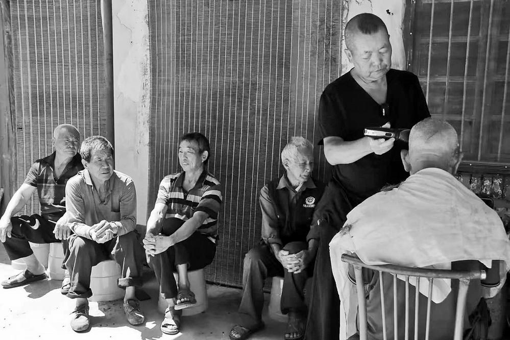 一面斑驳的方镜挂在老墙上,一把饱经岁月的理发椅吱呀作响,旁边摆着脸盆、水桶和几样简单的工具。几位老街坊早已坐在屋檐下的小板凳上,摇着蒲扇,聊着家常,笑声阵阵。见到一位老人蹒跚而来,邱德停下手中的推子,笑着招呼:“你来啦,先坐会儿,吃片西瓜,解解暑!”