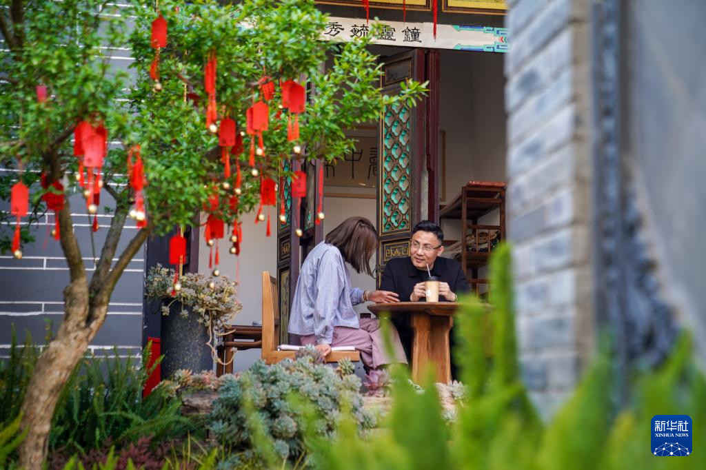 2026年3月24日,游客在白雾村读白书院(由楚黔会馆改造)喝咖啡。