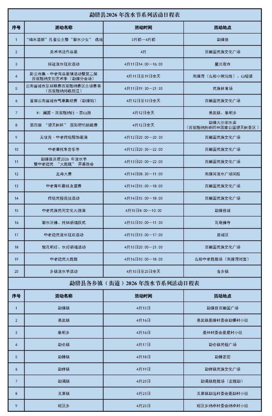 活动内容:2026年泼水节赶摆活动暨“宾弄赛嗨”联欢晚会、放火花、歌舞展演、高升颁奖仪式。