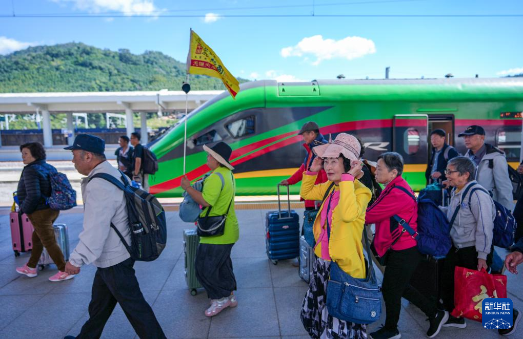 旅客乘坐列车抵达中老铁路磨憨站。新华社记者 陈欣波 摄