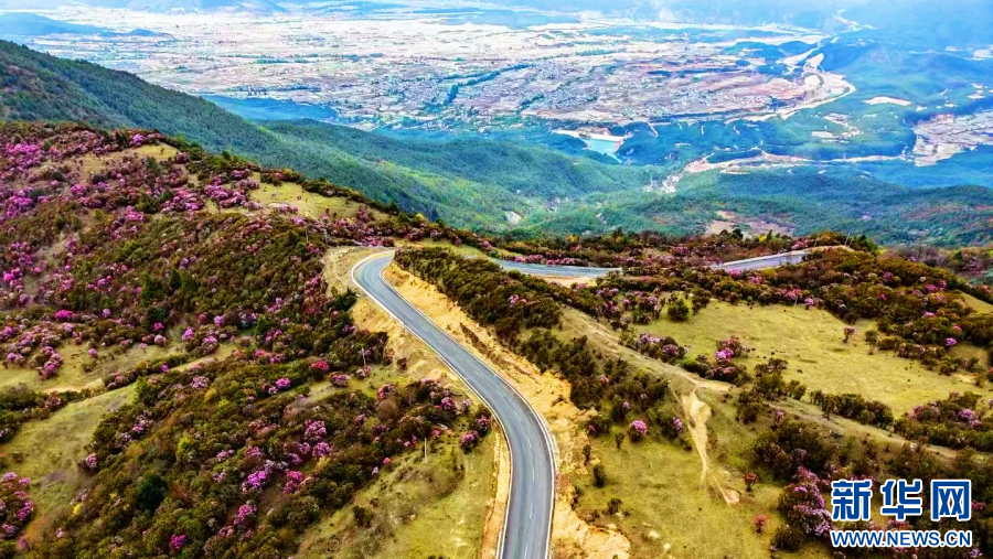 公路两旁,杜鹃花开(视频截图)。新华网发(剑川县委宣传部供图)