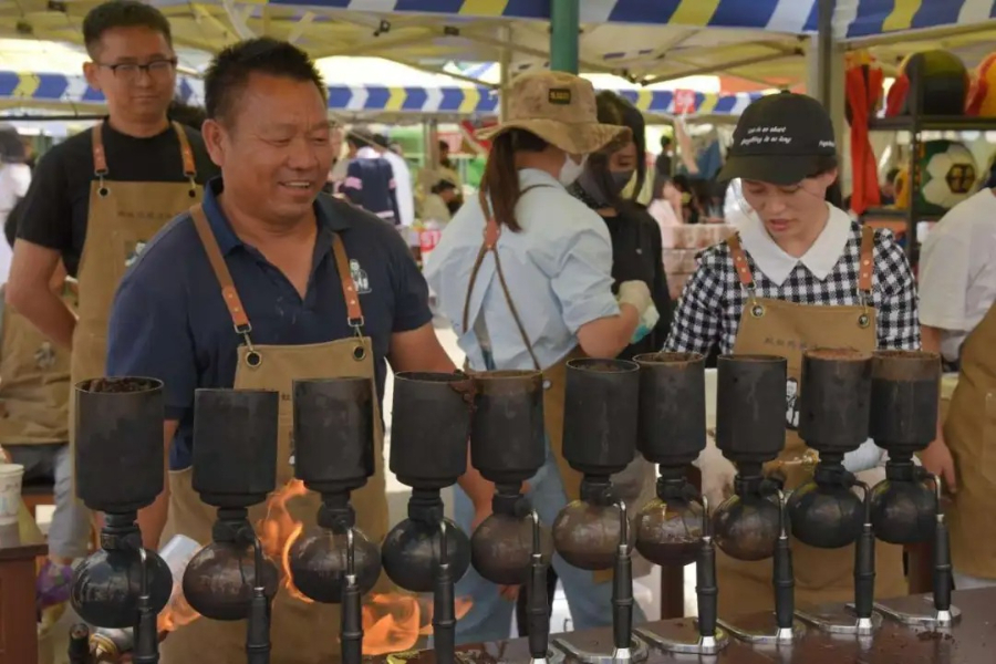 图为保山咖啡师“咖叔”现场展示咖啡技艺。张晓雪 摄
