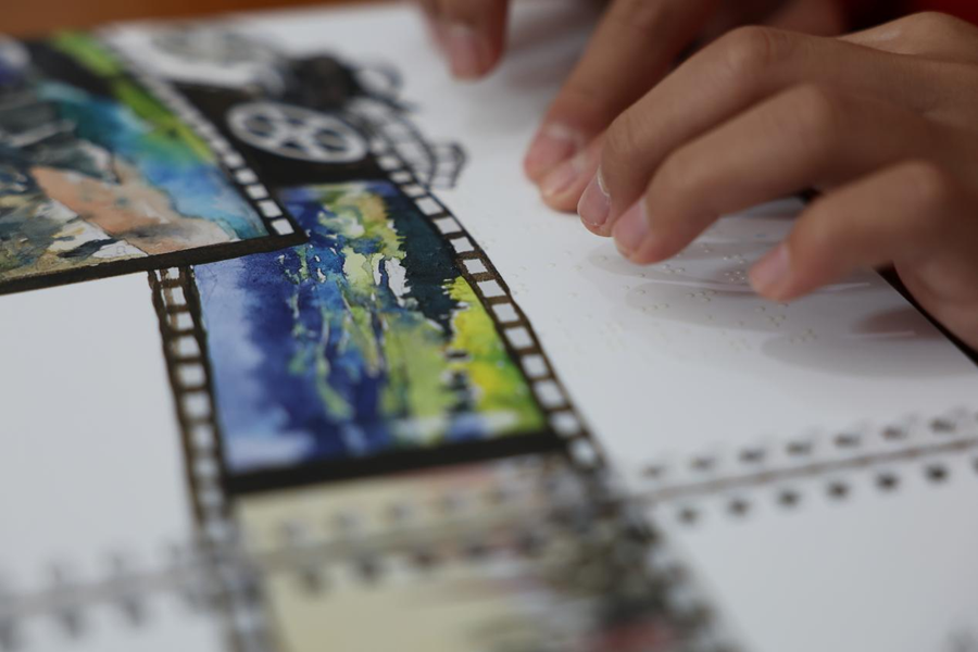活动现场摸读盲文(4月23日摄)。