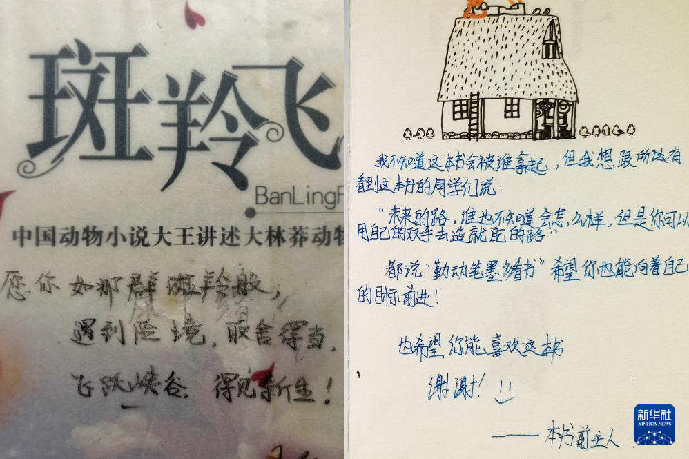 拼版照片:左右图为盐津县黄草社区农家书屋里拍摄的扉页留言。新华社发(陆志秋 摄)