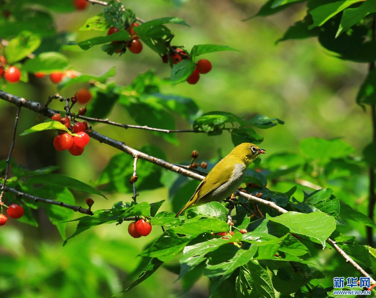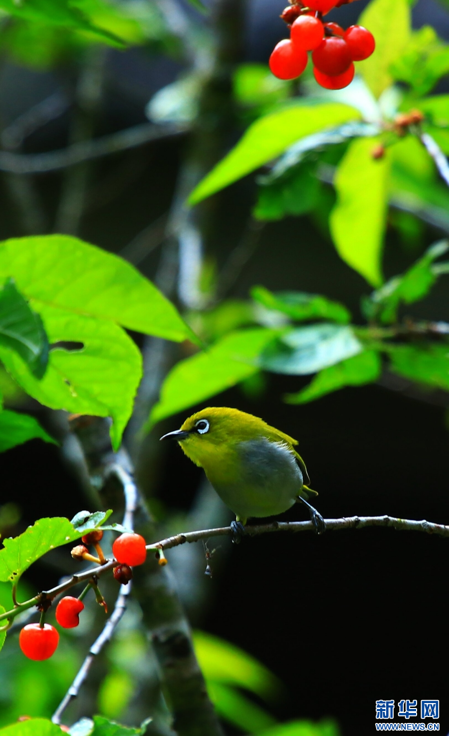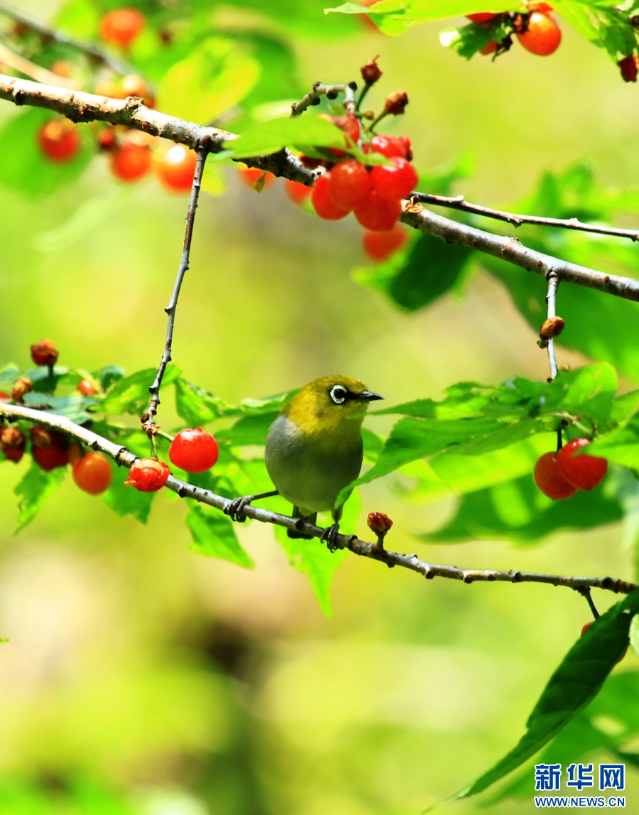 云南省腾冲市和顺镇,绣眼鸟在樱桃树枝头停歇(4月19日摄)。新华网发(赵辉 摄)