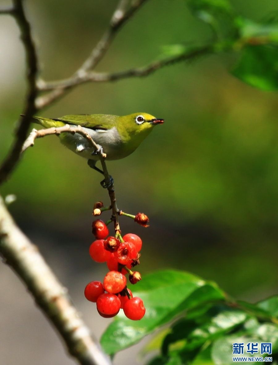 云南省腾冲市和顺镇,绣眼鸟啄食樱桃(4月19日摄)。新华网发(赵辉 摄)