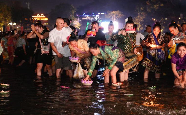 4月14日晚,云南省西双版纳傣族自治州澜沧江畔万人放水灯浪漫上演。各族群众身着盛装,将一盏盏以芭蕉叶、鲜花扎成的水灯放入江中,灯火顺水漂流,宛如星河坠入人间。