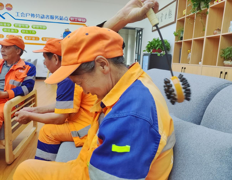 驿站内,一名环卫工人拿起桌上的敲打锤敲背(资料图)。中国石油云南销售公司 供图