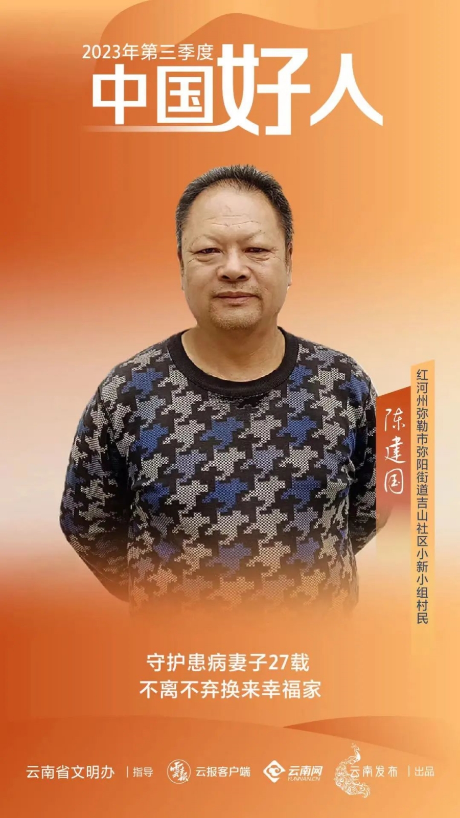 陈建国,男,汉族,1962年11月出生,红河哈尼族彝族自治州弥勒市弥阳街道吉山社区小新小组村民。面对妻子突发精神疾病,他不离不弃,悉心陪伴照顾;在家庭遭遇重大变故时,一人扛起家庭责任,把两个年幼的孩子抚养成人。