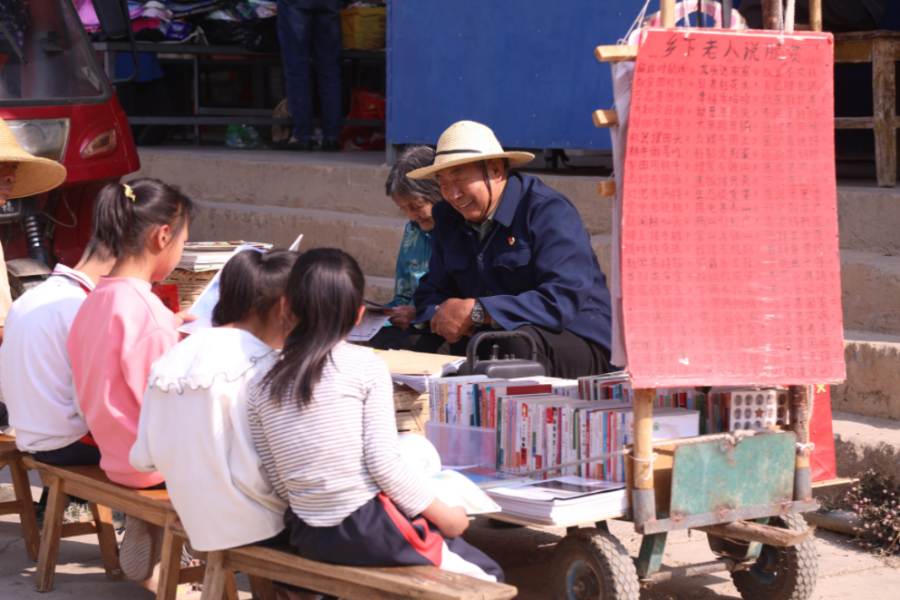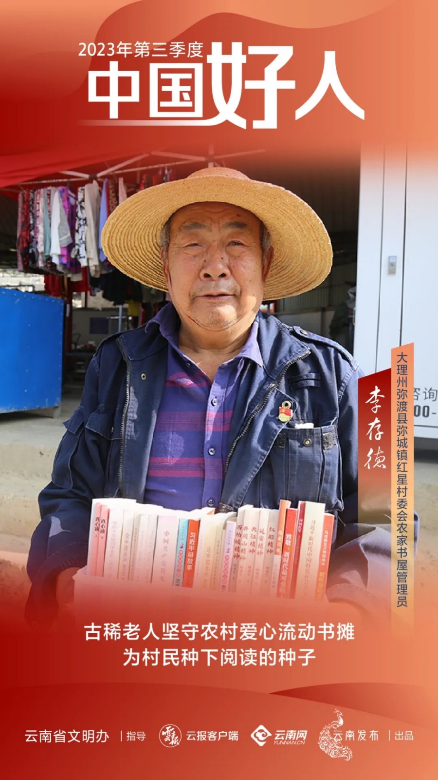 李存德早年在昆明东川矿务局矿务工程队工作,后因公受伤,退休回家休养。1992年,他回到家乡后一直热心服务家乡建设,积极投身村里的公益事业。2014年,李存德开始担任红星村委会农家书屋管理员。起初,前来看书和借书的人并不多,他心急如焚,一直在想怎么让村民到农家书屋借书看书。2019年,村委会旁边建了小集市,李存德看准了早上小集市人多,便把农家书屋“搬”到了小集市上。他自费购买了小推车和两个竹篮,自制了简易报架,开始推着车子到集市摆书摊,方便大家借阅。