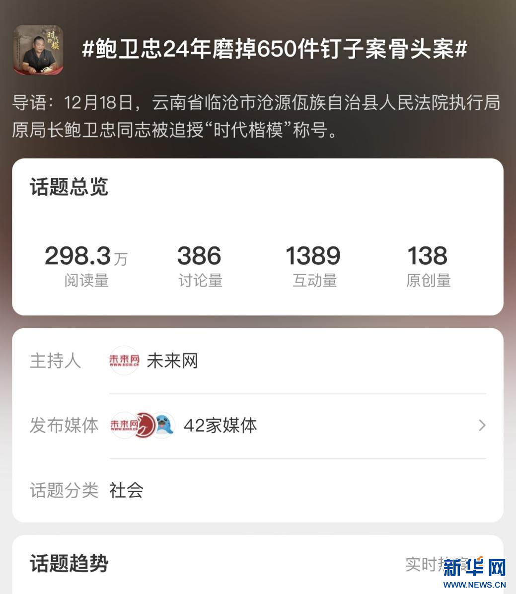 近日,中共中央宣传部追授鲍卫忠同志“时代楷模”称号。延续此前巡回报告会热度,在中央权威媒体、省级媒体、州市级媒体、政务新媒体、商业媒体全渠道广泛宣传报道下,“时代楷模”鲍卫忠同志的先进事迹短时间内在全国引起了热烈反响。据新华睿思数据云图分析平台监测显示,截至12月24日9时,全网有关中共中央宣传部追授鲍卫忠同志“时代楷模”称号的信息超24000条,一周时间内全网阅读量累计超2.6亿次。