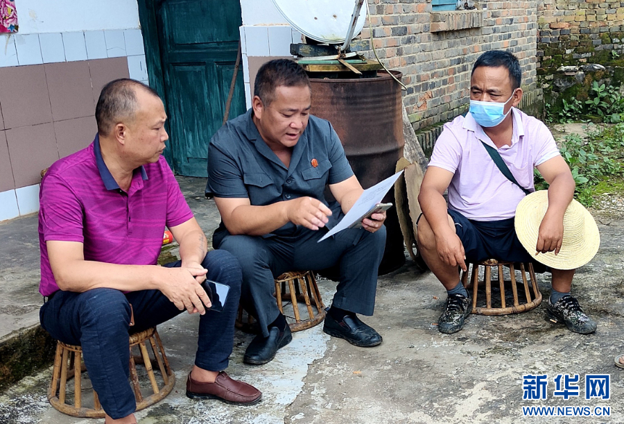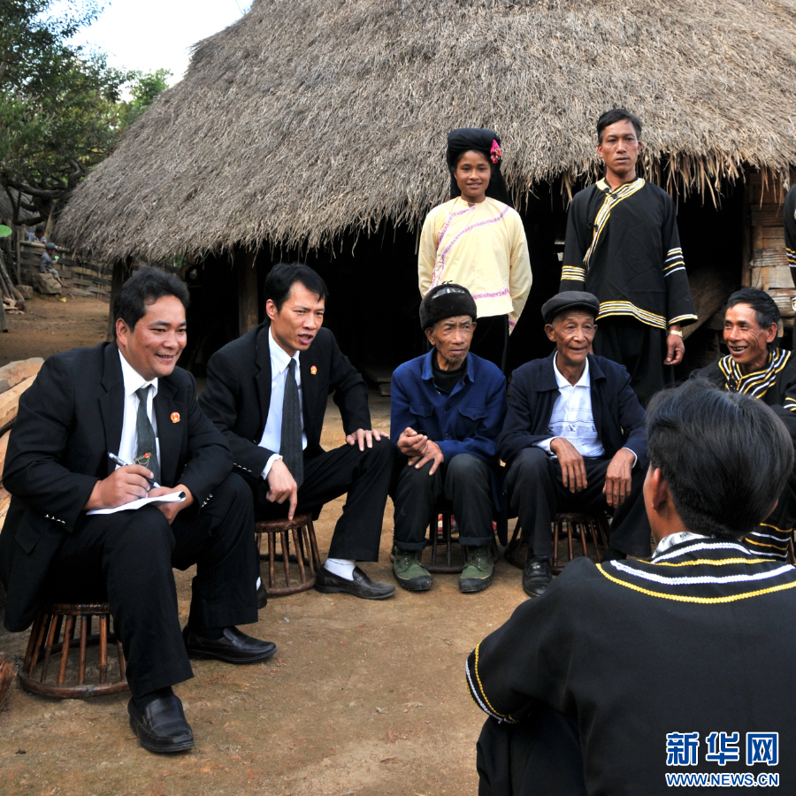 鲍卫忠(左一)在云南省沧源佤族自治县勐角傣族彝族拉祜族乡控角村委会小坝卡自然村巡回办案(资料照片)。