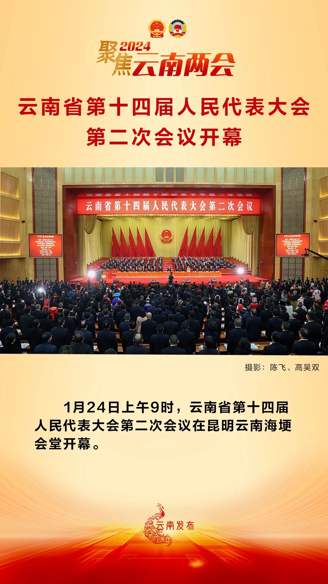 1月24日上午9时,云南省第十四届人民代表大会第二次会议在昆明云南海埂会堂开幕。