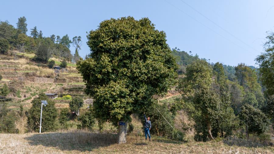 李永正在查看千年古树茶(3月12日摄)。杨荣辉 摄