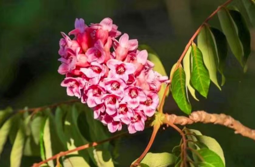 伯乐树又名钟萼木或山桃花,具有重要的科研价值,被列为国家二级保护野生植物。在大中山自然保护区茂密的树林中,这棵约20米高的伯乐树十分耀眼。树干挺拔、通直高大,树冠伞形、花朵形似风铃,一簇簇粉红跃出翠绿,姿态优美,宛如一位风姿绰约的少女在春风中巧笑嫣然。