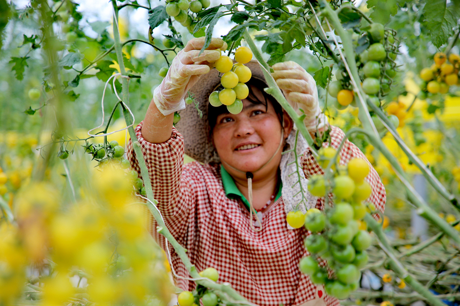 大理春沐源农业科技有限公司工人正在采摘成熟的樱桃番茄(2021年10月28日摄)。弥渡县融媒体中心 供图