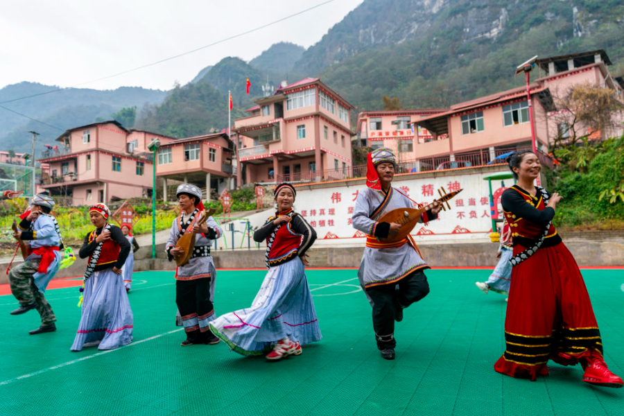2月22日,怒江傈僳族自治州福贡县鹿马登乡亚坪村村民在广场表演傈僳族舞蹈。新华每日电讯记者 陈欣波 摄