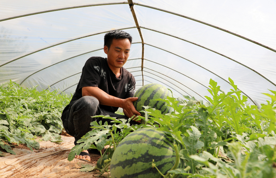 种植基地负责人吴志友在查看西瓜长势(6月27日摄)。