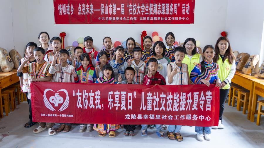 在龙陵县龙新乡小米地村,大学生志愿者们在社工带领下开展“友你友我,乐享夏日”儿童社交技能提升夏令营志愿服务。小米地村是傈僳族聚居的村落,寨子里的大多数家长外出务工,导致留守儿童和半留守儿童出现,儿童的社交能力有待提升。