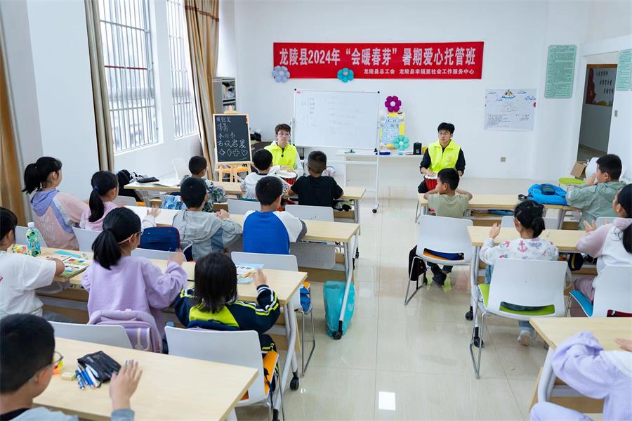 在龙陵县总工会举办的“会暖春芽”爱心托管班上,志愿者正带领孩子们认识节拍、韵律。针对上班族难以看护孩子的难题,龙陵县总工会从服务职工入手,组织假期回乡的大学生开展托管服务,工作时段全覆盖,缓解了职工的难题。大学生志愿者李暠表示,家长们把孩子送来托管班,是对志愿者们的信任。他们从动手能力、创新思维、逻辑思考、身体素质、艺术素养等方面开展好志愿服务,让家长们“托”得放心、孩子们“学”得开心。