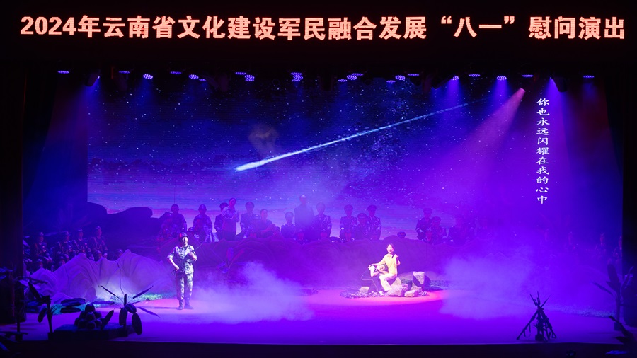 7月29日,2024年云南省文化建设军民融合发展“八一”慰问演出在昆明举办,现场上演了“军歌嘹亮颂祖国”大型情景组歌《铁血南疆》。本次活动旨在通过艺术的形式,深化军民鱼水情谊,共同庆祝即将到来的八一建军节,弘扬爱国主义精神。