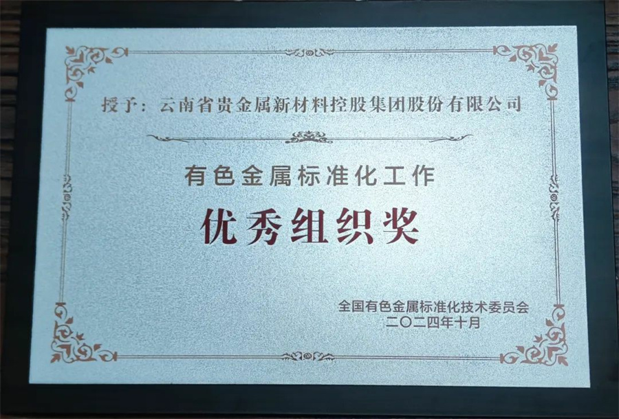 近日,云南省贵金属新材料控股集团股份有限公司(以下简称“贵金属集团”)荣获由全国有色金属标准化技术委员会颁发的有色金属标准化工作优秀组织奖。
