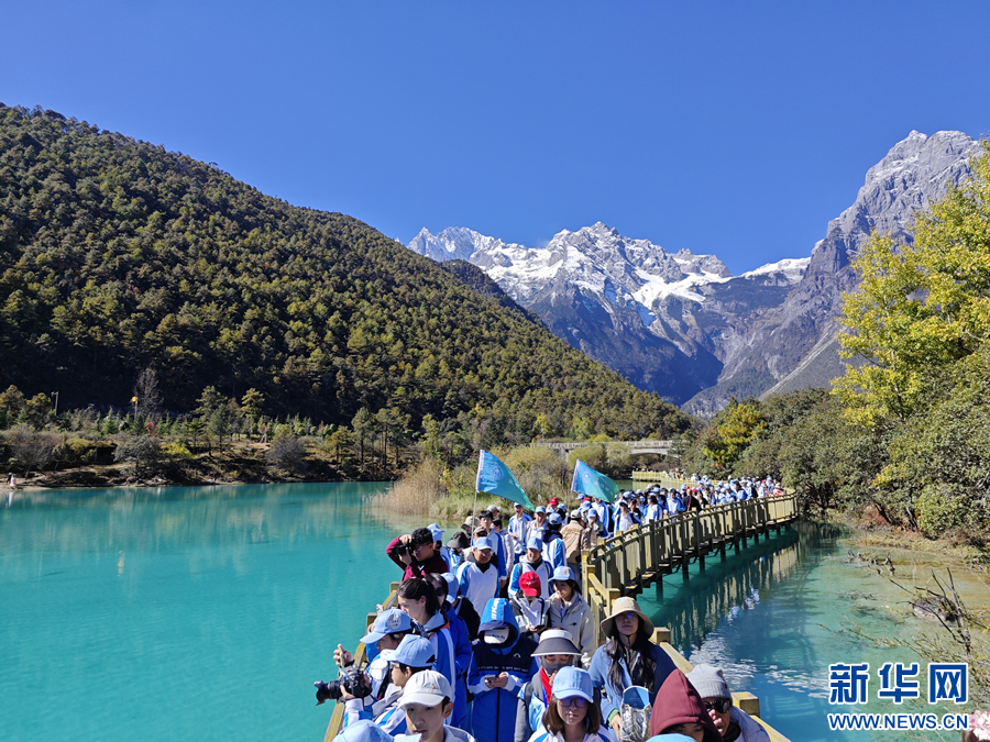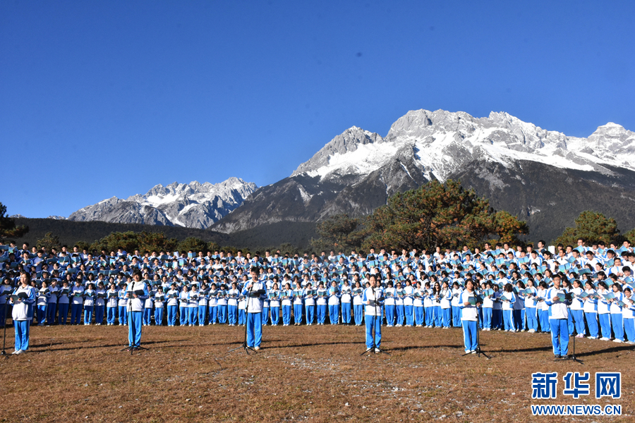 研学团在玉龙雪山下齐诵《一滴水经过丽江》(11月12日摄)。新华网发 和润仙 摄