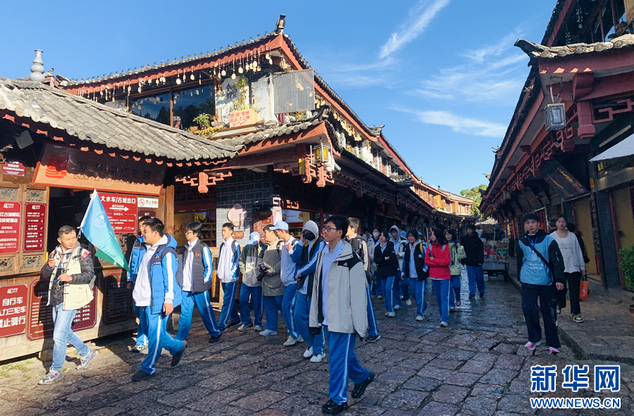 研学团师生在丽江古城游玩打卡(11月13日摄)。新华网发(木红豆 摄)