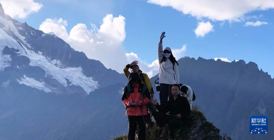 边玛永宗在徒步过程中和游客合影。新华社发