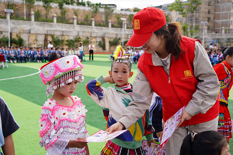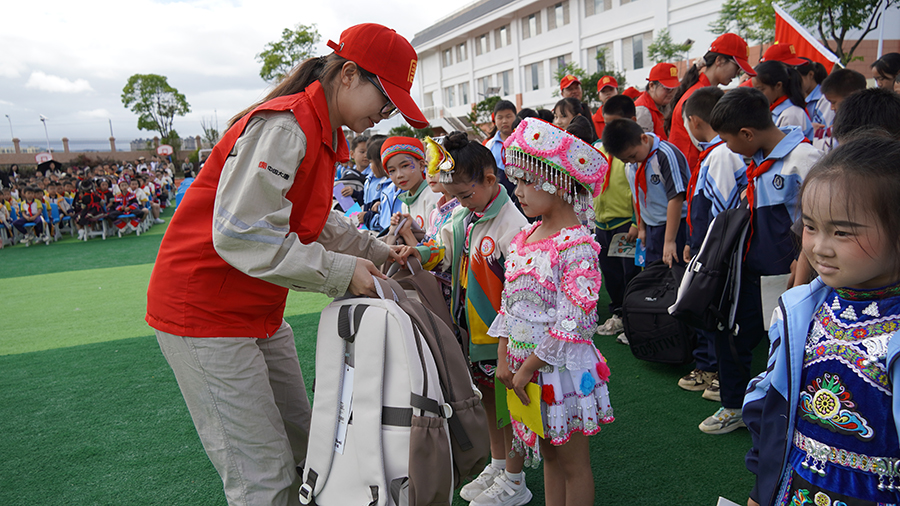 活动中,大唐滇东新能源事业部党委书记、执行董事玉仕辉组织青年志愿者们为该校100余名留守儿童、困境儿童赠送爱心学习文具及体育用品。