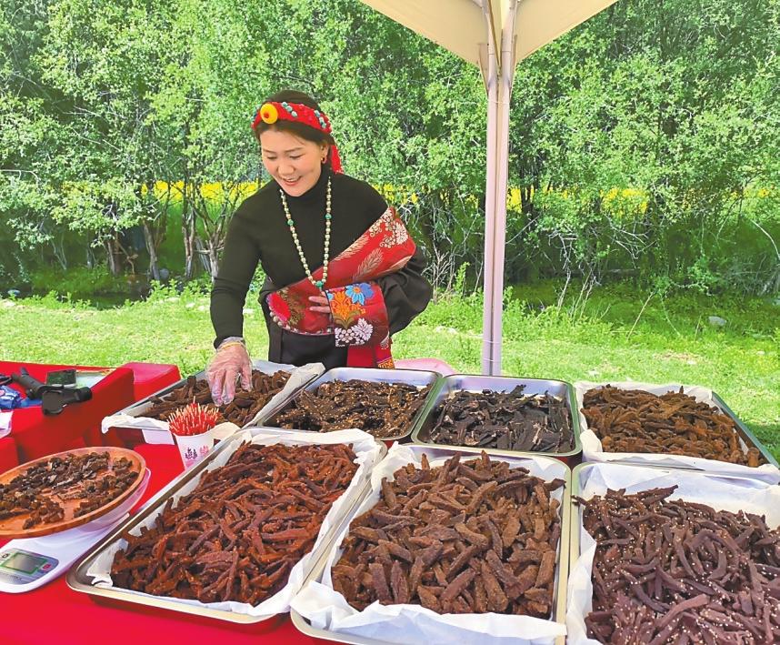 拉姆央宗向游客介绍牦牛肉干。
