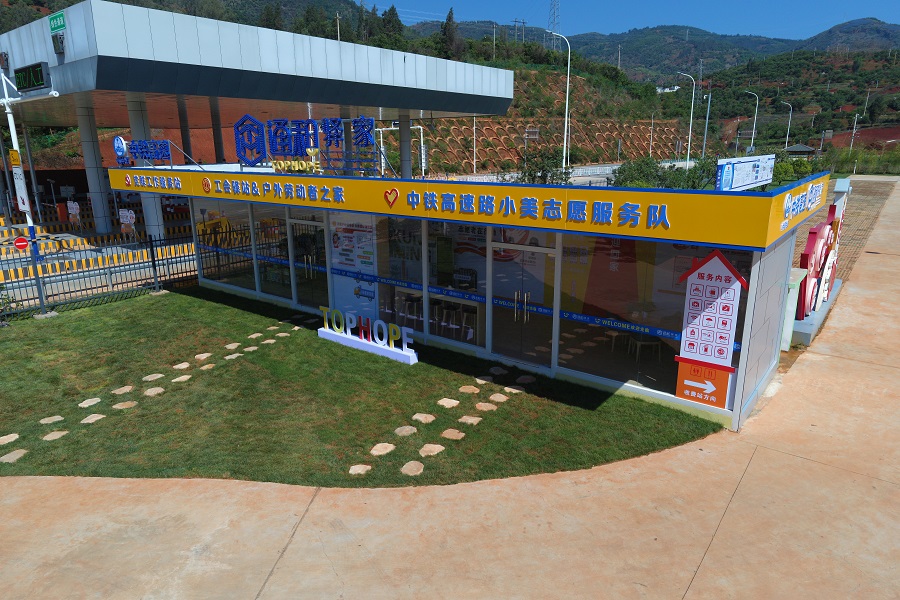 改变不止于视觉。在收费站广场,一个名为“通和驿家”的24小时综合服务站为司乘人员提供着周到的服务。站内不仅配备了休息区、微波炉、医药箱等设施,墙上醒目的工会服务热线,更体现了对户外劳动者的关怀。