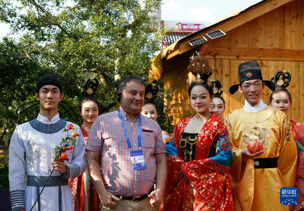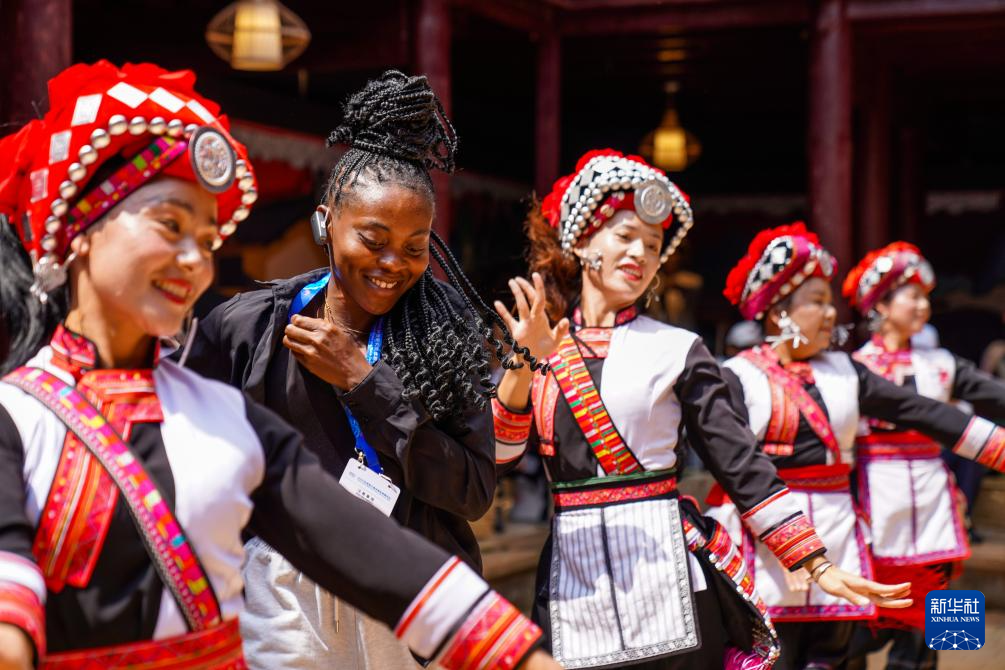 9月8日,与会代表(左二)在位于红河州弥勒市的可邑小镇体验民族歌舞。