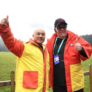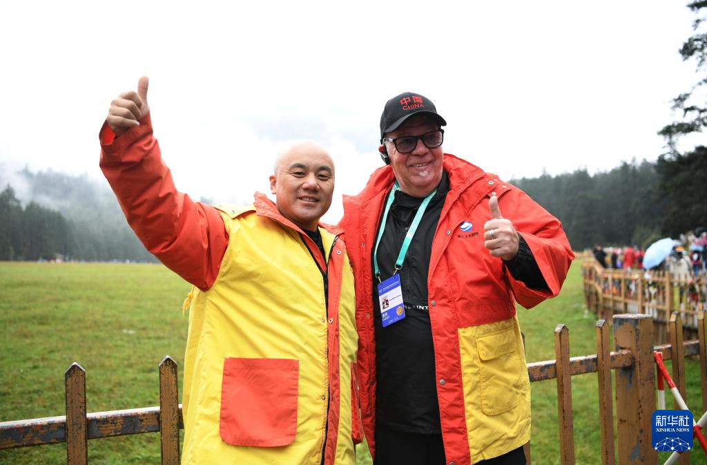 9月8日,与会代表(右)在丽江玉龙雪山景区的云杉坪留影。