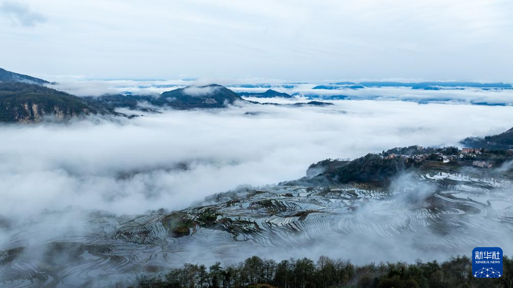 这是2月26日在云南省元阳县拍摄的哈尼梯田风光(无人机照片)。新华社记者 胡超 摄