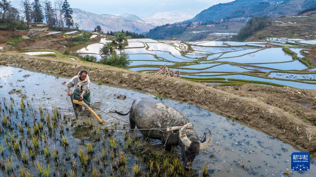 在云南省元阳县阿者科村,村民在驱牛犁田。新华社记者 胡超 摄