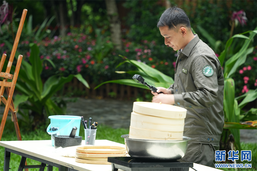 周向国体验象粪造纸全过程(6月28日摄)。新华网发(徐华陵 摄)