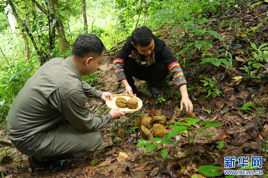 周向国(左)和李晋元(右)一起捡象粪(6月28日摄)。新华网发(徐华陵 摄)